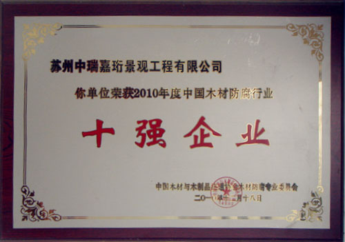 2013年在《中國木材保護工業協會》的組織下,我公司榮獲本年度防腐木企業評選《防腐木材企業十強》稱號。